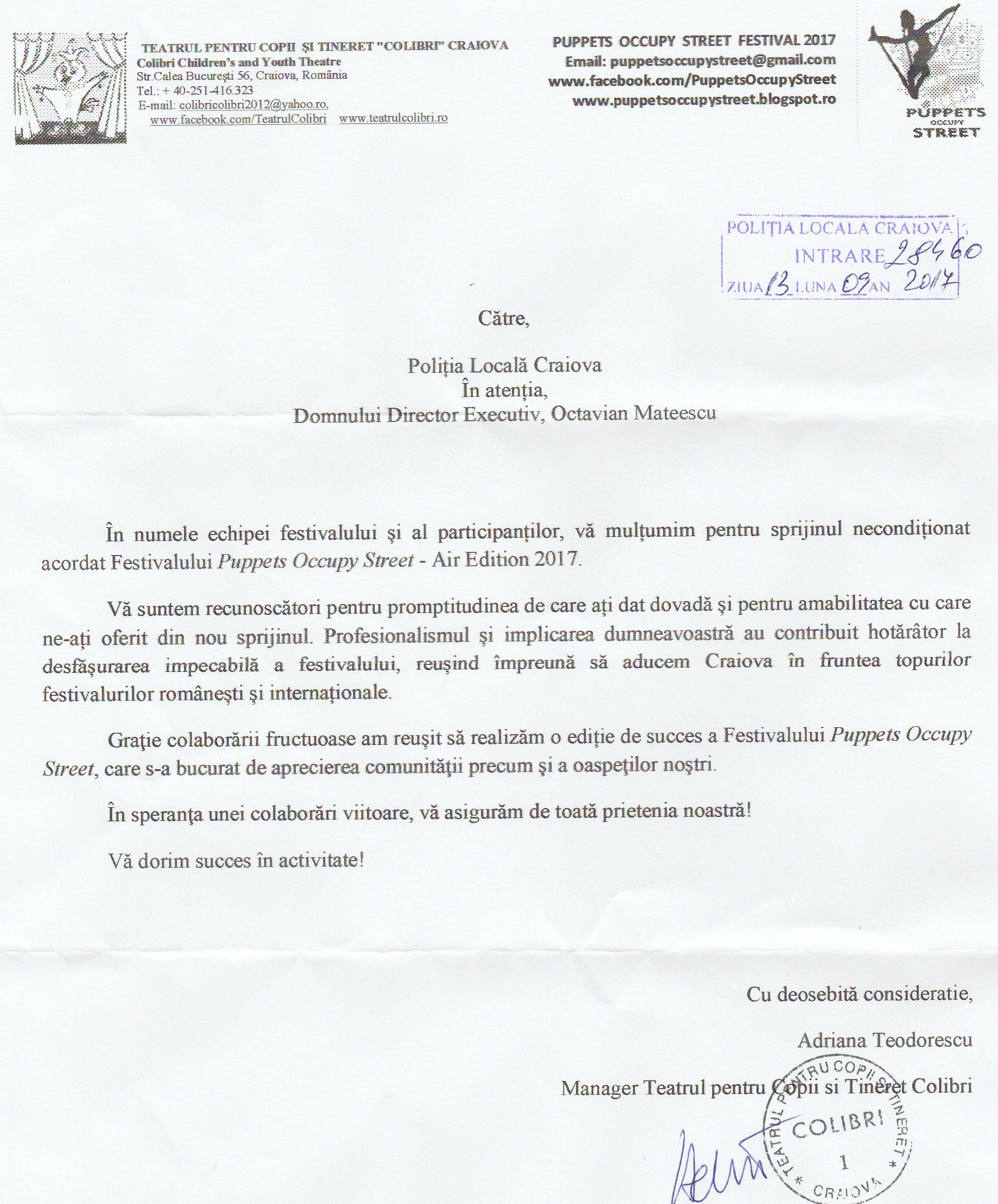 Scrisoare de felicitare din partea Teatrului pentru Copii si Tineret "Colibri"