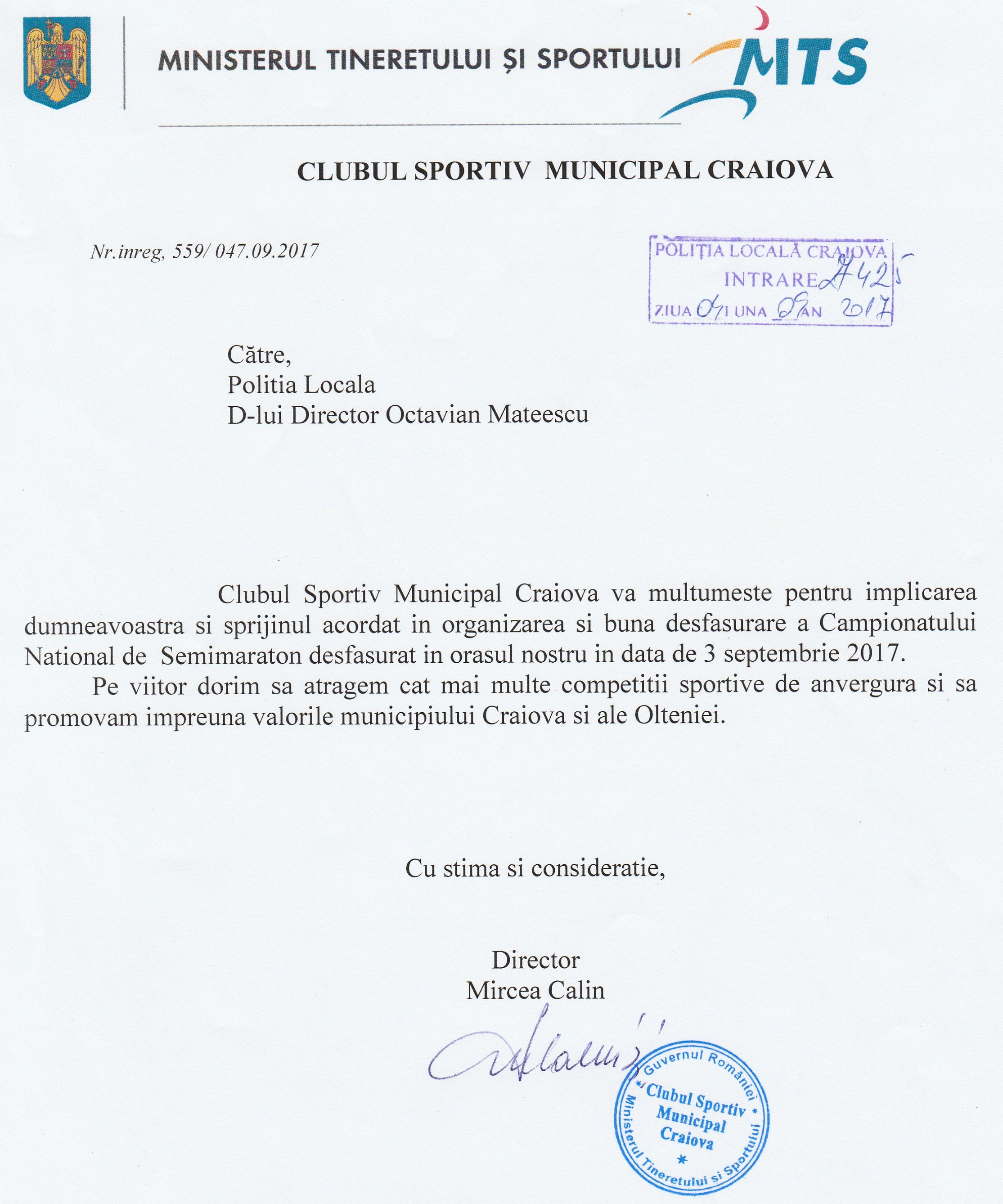 Ministerul Tineretului şi Sportului mulţumeşte Poliţiei Locale a Municipiului Craiova pentru sprijinul acordat la organizarea Campionatului Naţional de Semimaraton
