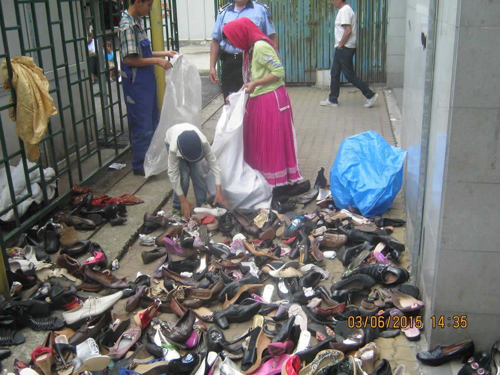 Persoane de etnie rromă comercializează diverse produse de îmbrăcăminte și încălțăminte second-hand