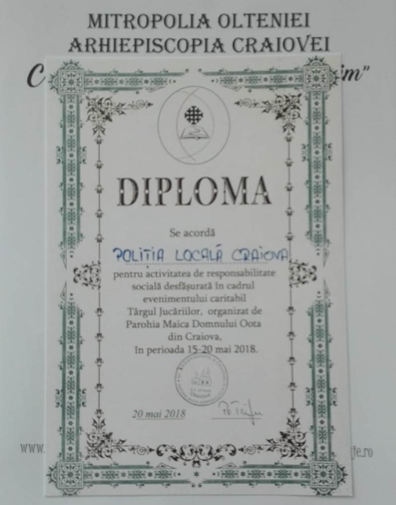 Mitropolia Olteniei apreciază implicarea Poliţiei Locale pentru desfăşurarea evenimentului caritabil "Târgul Jucăriilor"